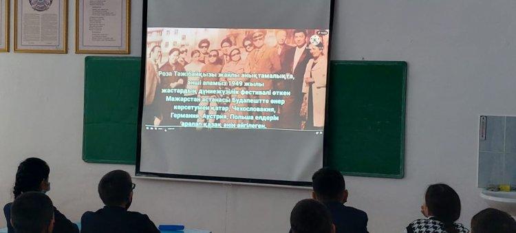 Р.Бағланованың 100жылдық мерейтойына орай "Тамаша адамдардың өмірі" атты еске алу күніне сынып жетекшілер Мудриченко И.И., Жумаканова А.А., Жанузакова Г.А., Атымтаева Б.Б., Турсынова Б.Ж., Нурмухамедова А.Д., Сақаева Қ.Н. КСРО Халық әртісі Роза Бағланова туралы деректі фильм көрсетілімін ұйымдастырып, әнші шығармашылығы жайлы танымдық тәрбие сағаттарын өткізді. Оқушылар әншінің өмірі мен шығармашылығы туралы көптеген ақпараттар алды.