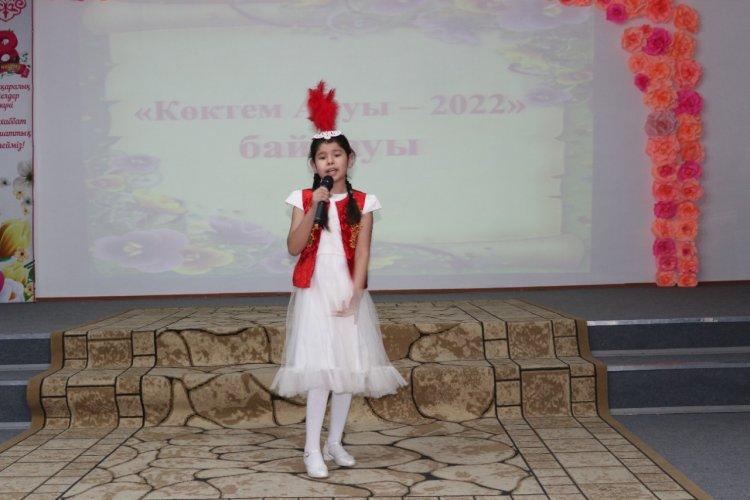 Ұлыстың Ұлы күні - Март мерекесіне орай 9-10-сынып қыздары арасында мектепішілік "Көктем аруы - 2022" байқауы ұйымдастырылды. Байқауды арулар өздерін таныстырудан бастап, 2021-2022 оқу жылындағы атаулы дата тұлғаларының шығармаларынан көркем сөз оқумен жалғастырды. Сонымен қатар, қыздарымыз ерекше шаш үлгісін көрсетіп, пәндер бойынша және қазақ халқының салт-дәстүріне қатысты сұрақтарға жауап беру арқылы өз білімдерін ортаға салды. "Көктем аруы - 2022" атағы 10-сынып оқушысы Садакова Бинурға бұйырып, Бас жүлде иегері атанды.
