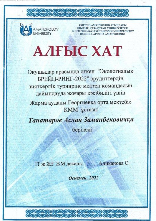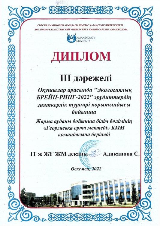 С.Аманжолов атындағы Шығыс Қазақстан университетінің ұйымдастыруымен оқушылар арасында "Экологиялық БРЕЙН –РИНГ - 2022» эрудиттердің зияткерлік турнирі өтті. Турнирге « Георгиевка орта мектебі» КММ- нің «Жасыл әлем» тобы қатысып, ІІІ дәрежелі Диплом иегерлері атанды. Топ құрамындағы 10- сынып оқушылары Асемқанов Расул, Айкенова Аружан, Садақова Бинұр, Турсунова Еркежан Сертификат иеленсе, жетекшілері география пәні мұғалімі Танатаров Аслан Заманбекович Алғыс хат иегері атанды.