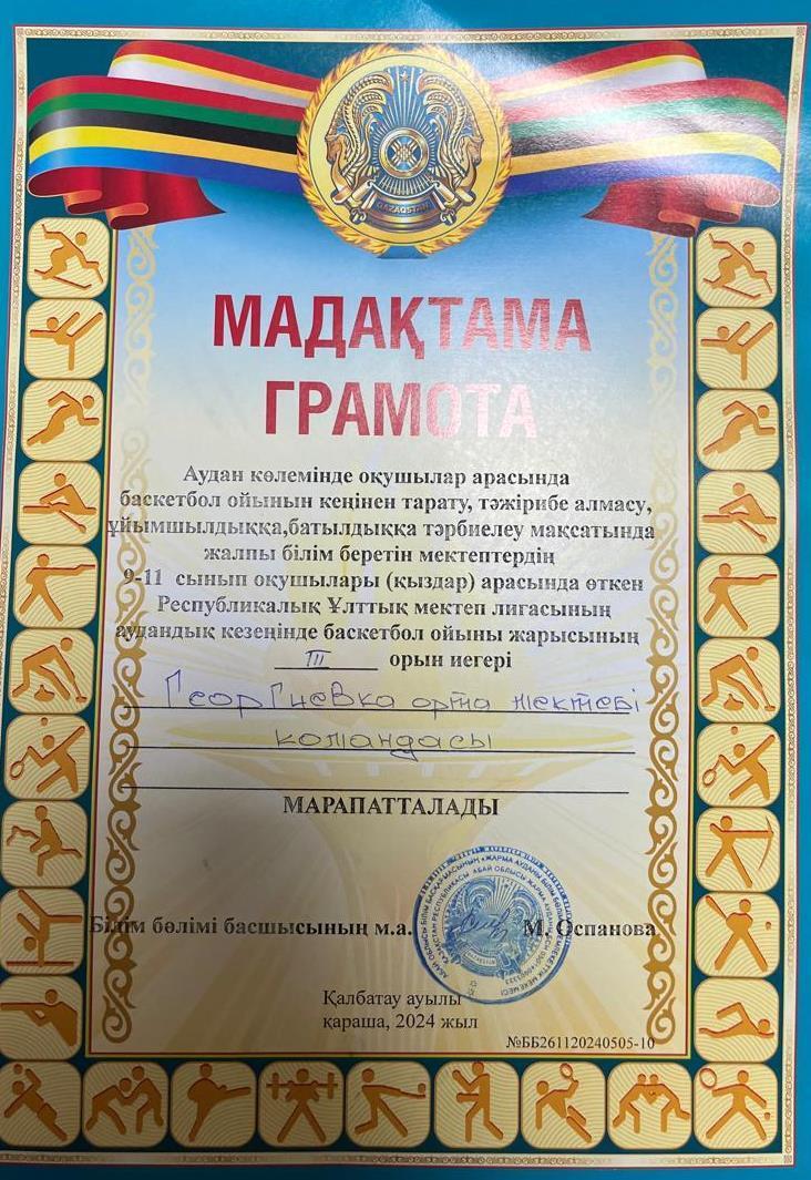 Жалпы білім беретін мектептердің 9-11 сынып оқушылары арасындағы Ұлттық мектеп лигасы аясында баскетбол ойынынан аудандық жарыста мектебіміздің қыздар құрама командасы жүлделі ІІІ орын иеленді.