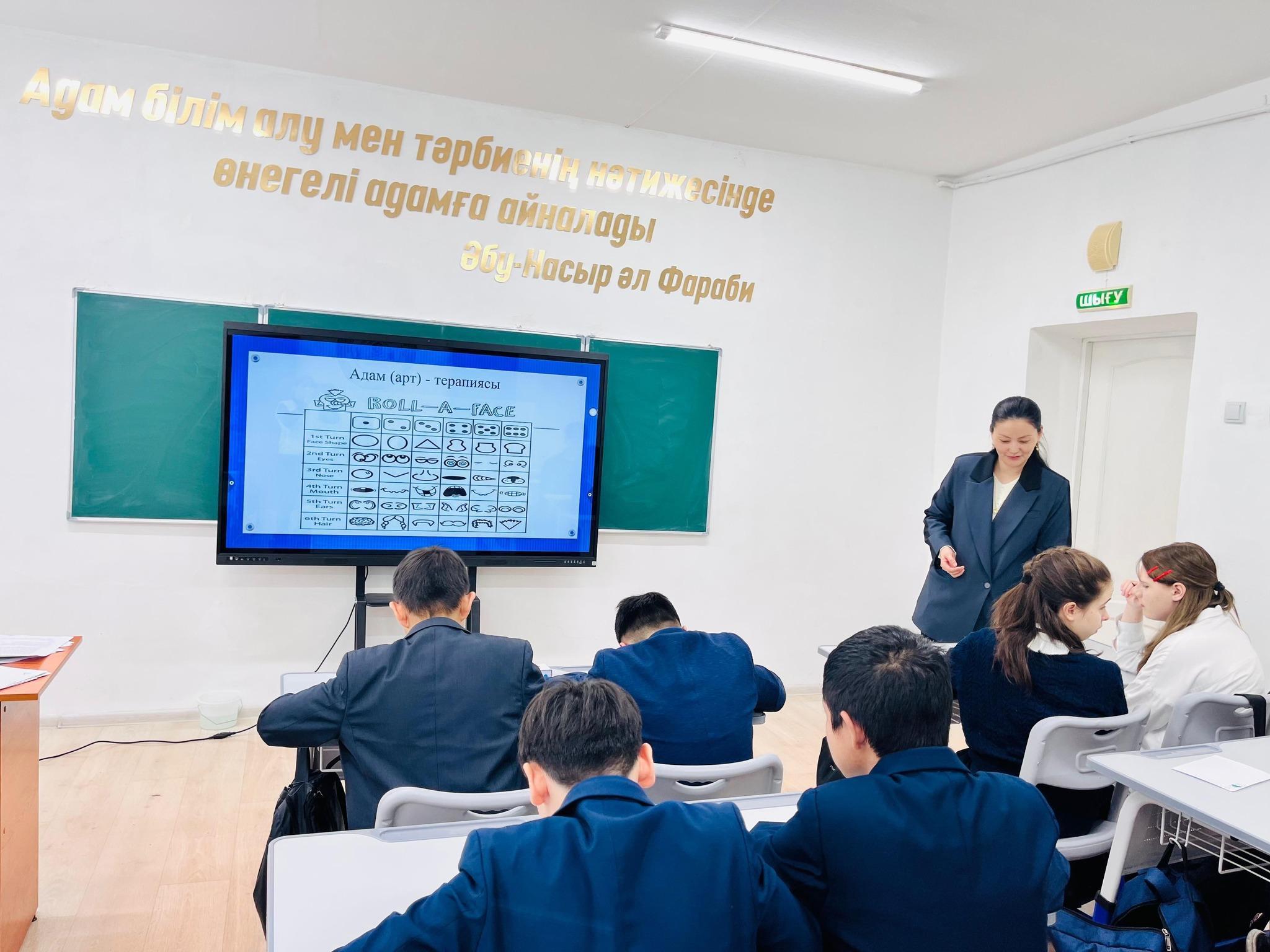 «ДОСБОЛLIKE» достық қолын ұсын акциясы аясында мектеп психологтары А.Кокиева мен Б.Қабидоллаева 8 “А” сыныбымен оқушылардың өзара жағымды қарым-қатынасын дамыту мақсатында “Достық бірлікте” тақырыбында тренинг ұйымдастырды. Тренинг оқушылардың жылы пейілмен амандасуы арқылы басталып, “Тоқтап қалма!” сергіту ойынымен жалғасты. Достық қарым- қатынасты нығайту мақсатында өткізілген “Тыңда мені” ойыны мен “Жираф”, “Адам” арт- терапия техникасын практикада қолдану арқылы бір- бірімен тығыз байланыста болды. Тренинг соңында оқушылар мақсатқа жетудің маңызын түсініп, өз ойларын ортаға салды.