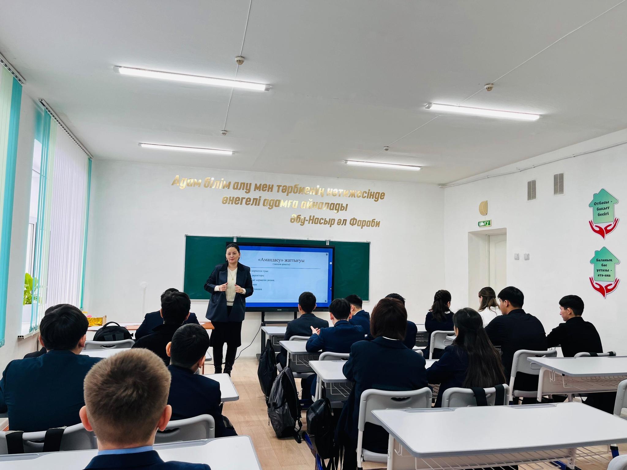 «ДОСБОЛLIKE» достық қолын ұсын акциясы аясында мектеп психологтары А.Кокиева мен Б.Қабидоллаева 8 “А” сыныбымен оқушылардың өзара жағымды қарым-қатынасын дамыту мақсатында “Достық бірлікте” тақырыбында тренинг ұйымдастырды