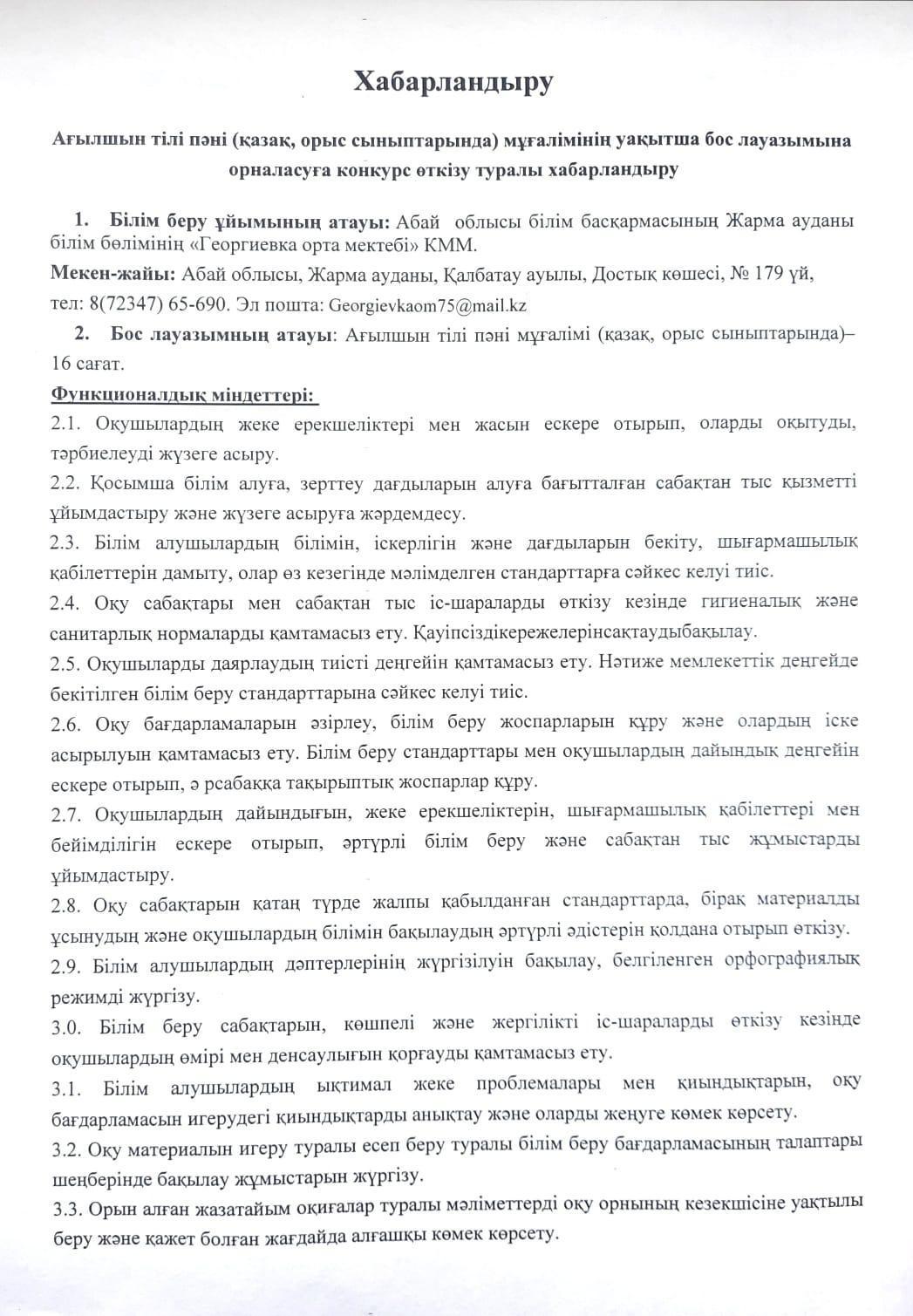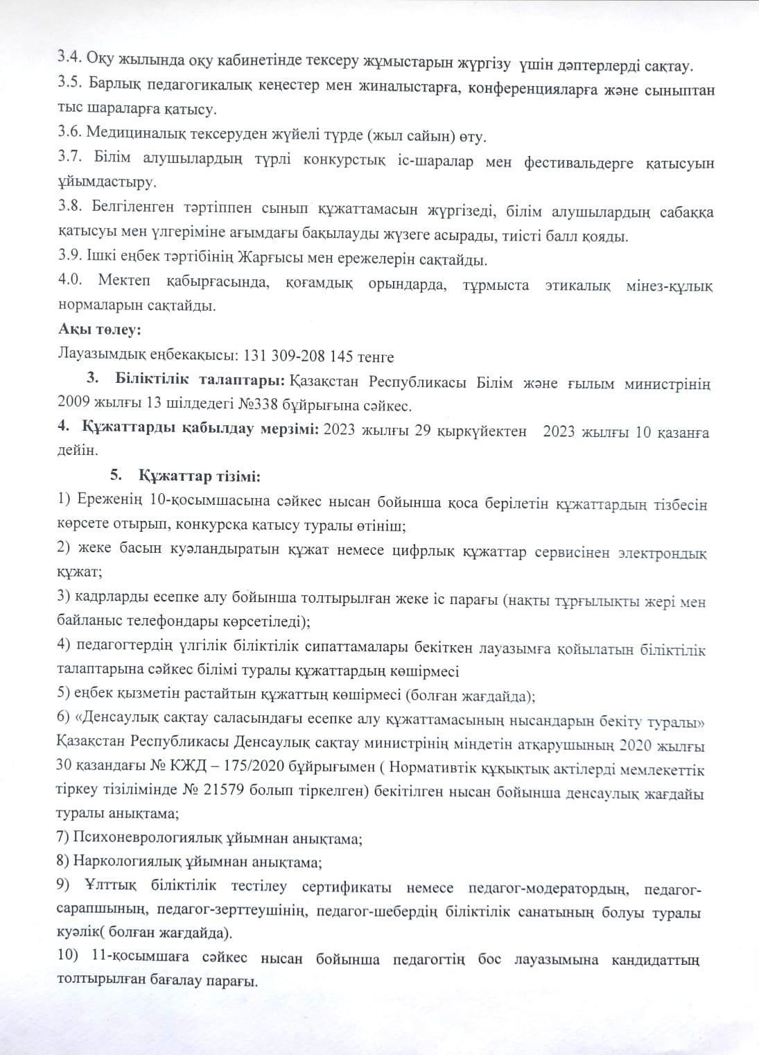 29 сентябрь 2023 0 1 2 3 4 5 Ағылшын тілі пәні мұғалімінің уақытшы бос лауазымы бойынша конкурсқа хабарландыру