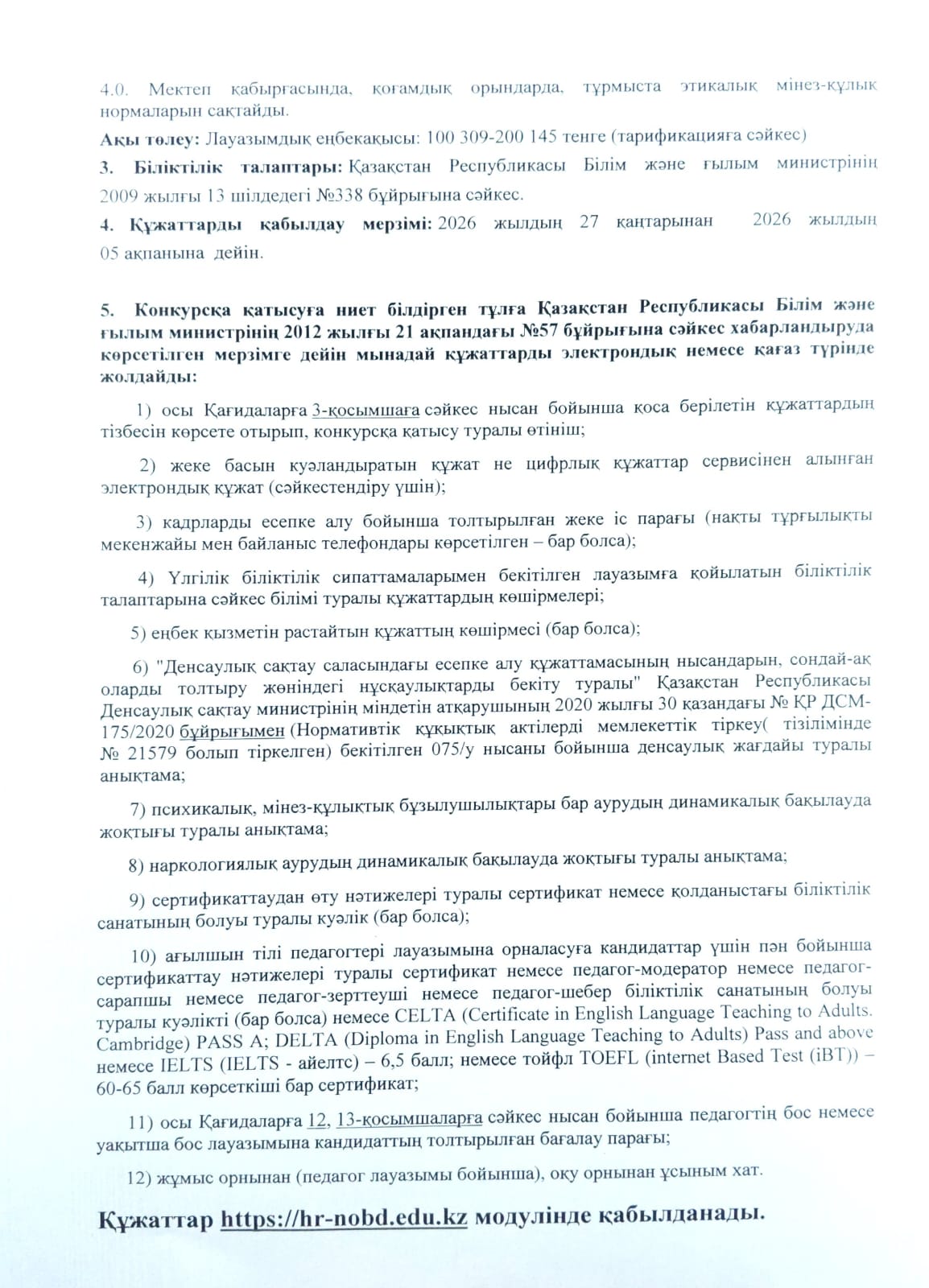 Физика пәні мұғалімінің уақытша бос лауазымына орналасуға конкурс