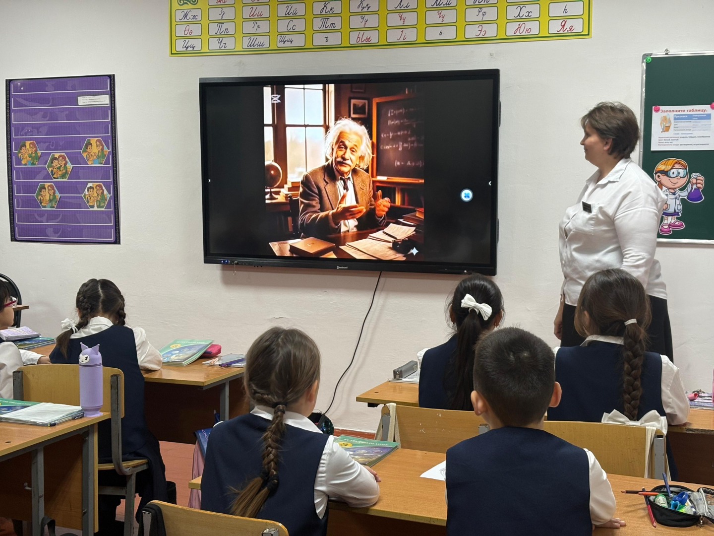 Интеллектуальные технологии были внедрены в урок в виде видеоролика с Эйнштейном, который рассказал детям о четвёртом состоянии вещества — плазме.