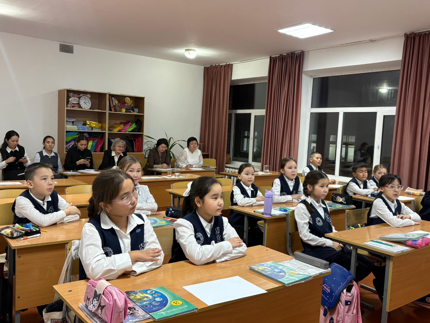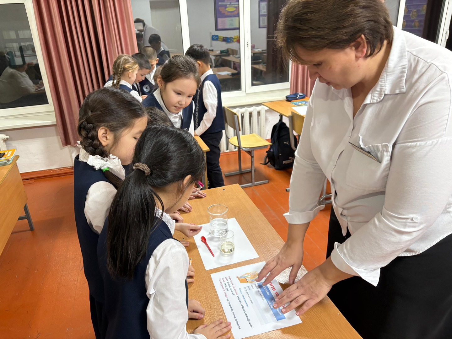 В ходе урока были проведены парная, индивидуальная и групповая работы. Дети познакомились с новым понятием — агрегатные состояния вещества. Также был проведён опыт с водой, солью, растительным маслом и мелом. Целью опыта было изучение свойств веществ и развитие умения описывать их.