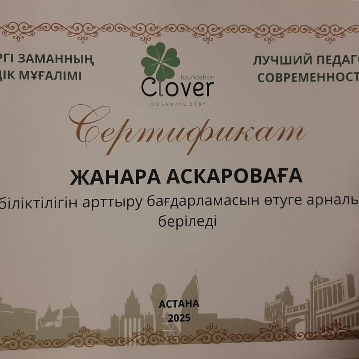 Астана қаласында "Clover Foundation" Қоғамдық қоры инклюзивті білім беру тәжірибелерін тиімді қолдану саласындағы "Қазіргі заманның үздік мұғалімі" байқауын өткізді. Байқауға бастауыш сынып мұғалімі Аскарова Жанара Багидулаевна қатысып, инклюзивті білім оқыту қағидаттарын практикада қалай жүзеге асыратынын көрсетіп, Сертификат иеленді.