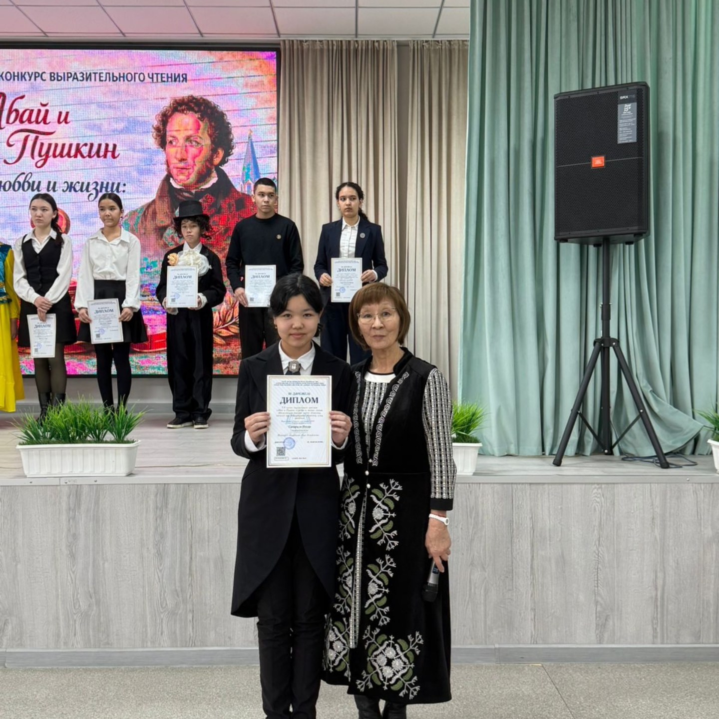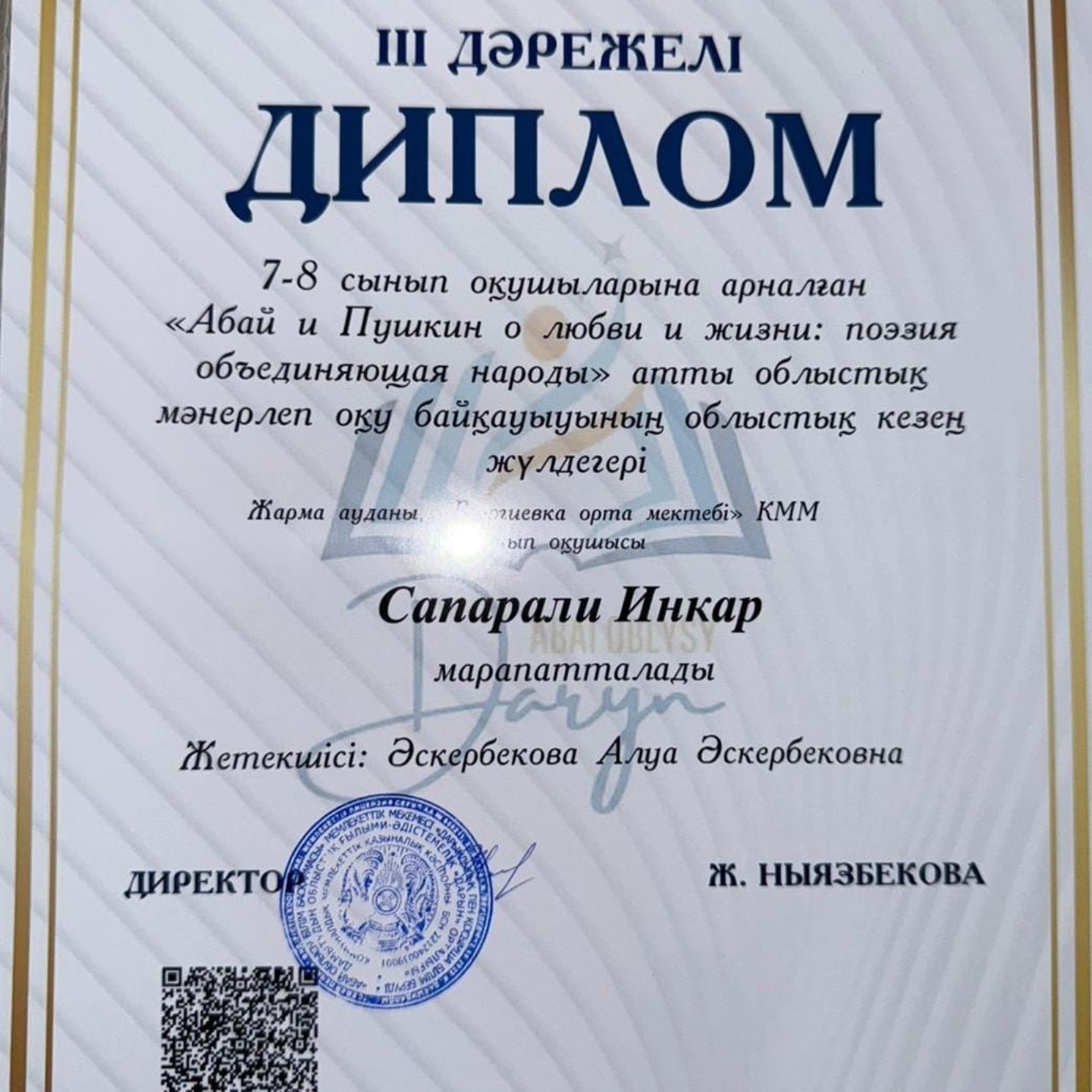 Жалпы білім беретін мектептердің 7–8 сынып оқушылары арасында «АБАЙ И ПУШКИН О ЛЮБВИ И ЖИЗНИ: ПОЭЗИЯ, ОБЪЕДИНЯЮЩАЯ НАРОДЫ» атты мәнерлеп оқу байқауының облыстық кезеңіне 7 "А" сынып оқушысы САПАРӘЛІ ІҢКӘР қатысып, ЖҮЛДЕЛІ ІІІ орыниегерлері атанды.