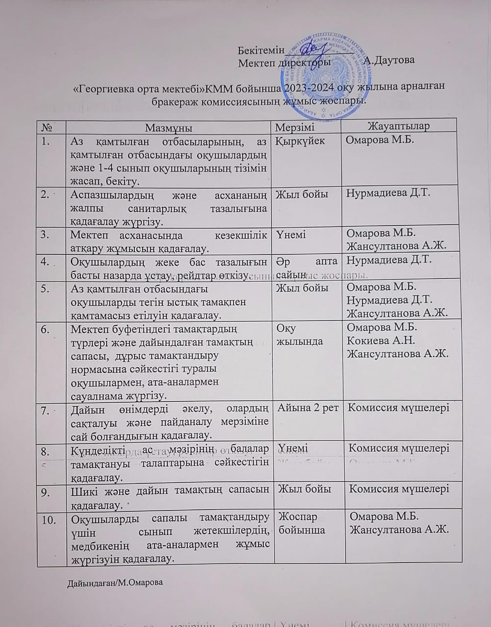 2023-2024 оқу жылына арналған бракераж комиссиясының жұмыс жоспары. » «Георгиевка орта мектебі» КММ